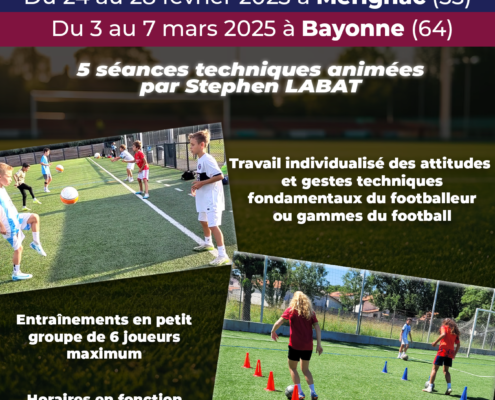 EntrainementsLes entraînements techniques seront dispensés pendant les vacances de la Nouvelle Aquitaine à Mérignac(33) la 1ère semaine et à Bayonne(64) la 2ème semaine.